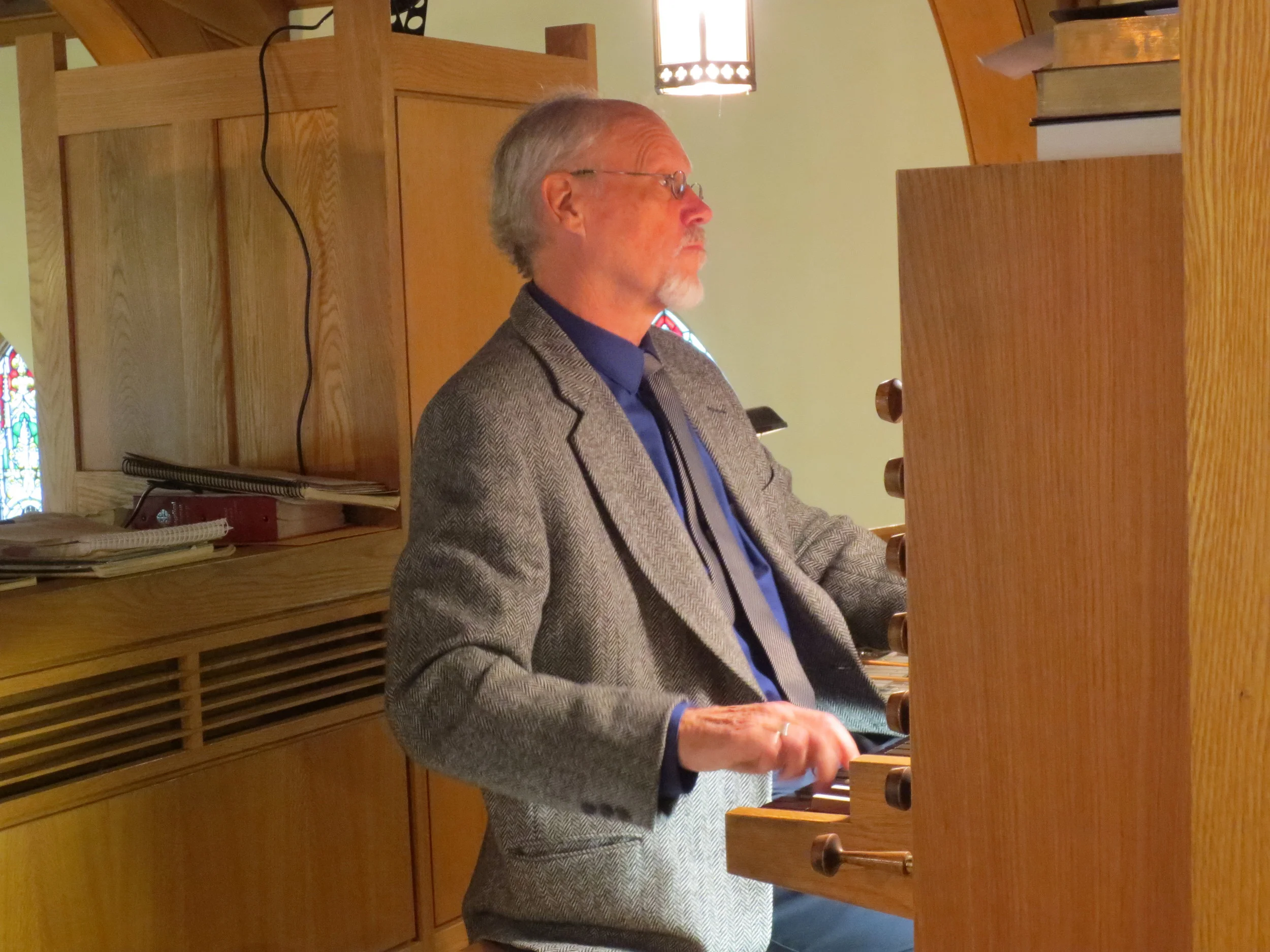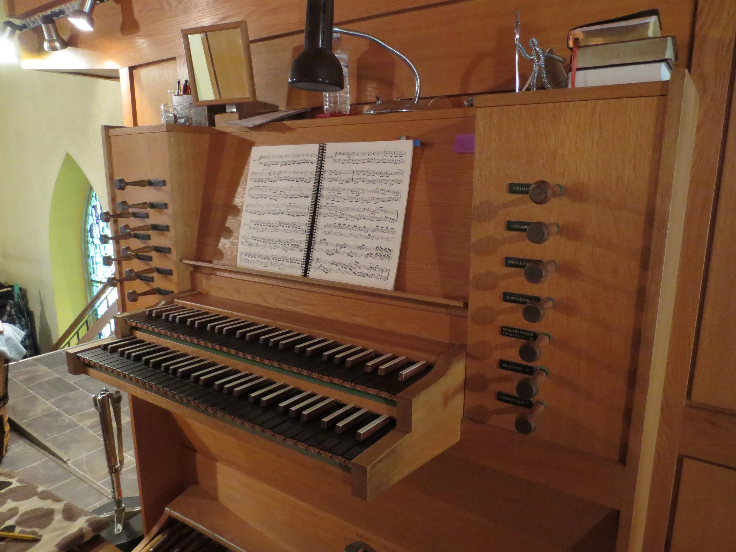 Down at the stop-pulling level, I am rewarded by the overtones in the Quintadena that beg to be allowed in the spotlight. Plaintive/Comical? A tragi-comedy comes to mind. The tremulant defies to be categorized. Imperceptible with one stop on. Gentle when two stops are pulled. Wagnerian when digging deep for air. The reeds say, "Let's play French Baroque with the saints who have gone before us". Above all, it is a sociable instrument. It really enjoys playing with other instruments and the feeling is mutual judging by the number of musicians who comment on its good manners.