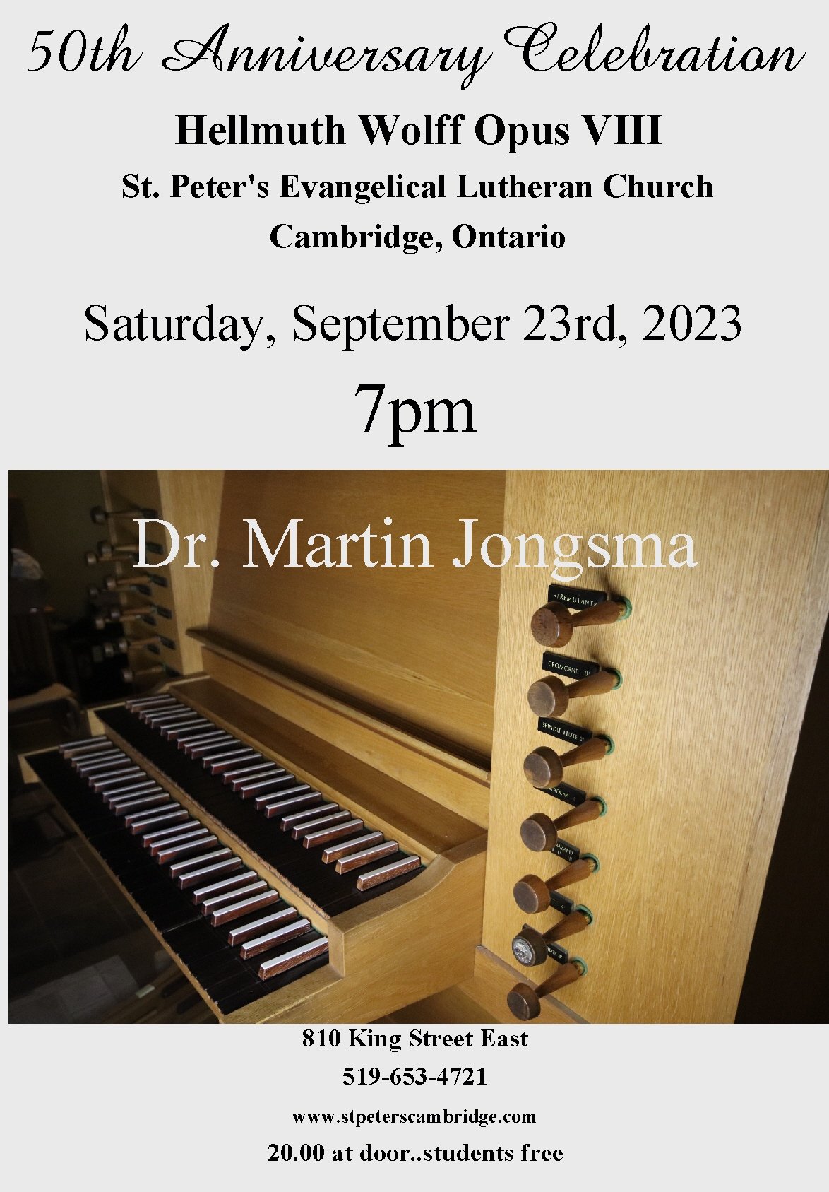 Reverend Dr. Don Nevile launched the year by covering the January 1st Sunday service for me. Dr. Peter Nikiforuk (past National President of the RCCO) presented the first recital in the four part series, January 22nd, (Lebegue, Bohm, Buxtehude, Krebs, Gardonyi, Lubeck, Bach). The RCCO-WW Members’ recital on February 19th featured David Hall (Blessed Sacrament RC) , Chris Bramble, students Ruby Worden and Austin Heinbuch, Scott Knarr (St. Matthew’s Lutheran Church, Kitchener), Corinne Dutton (St. Matthew’s Lutheran Church emeritus), Chris Kovarik (guest composer from Toronto), Angus Sinclair (newly appointed director of music at St. John’s Anglican, Kitchener), and Kevin Lee (Redeemer Lutheran, Waterloo). Bradley Moggach, March 19th(Bach’s Ein’feste Burg and Allein Gott, Bruhns, Bohm Dandrieu, Guilain, Max Reger’s Introduction und Passacaglia). Dr. Martin Jongsma closed the series on September 23rd (Praetorius, Sweelinck, Bohm, Bach Trio Sonata VI, Clerambault, and Thalben-Ball). In addition to playing a demanding program at the highest level, Jongsma took the opportunity to highlight the depth of the organ by honouring its central role as an instrument to lead congregational song. He included in his program the hymn Lobe den Herren (Introduction, three stanzas with audience participation) improvised and arranged by Jongsma).